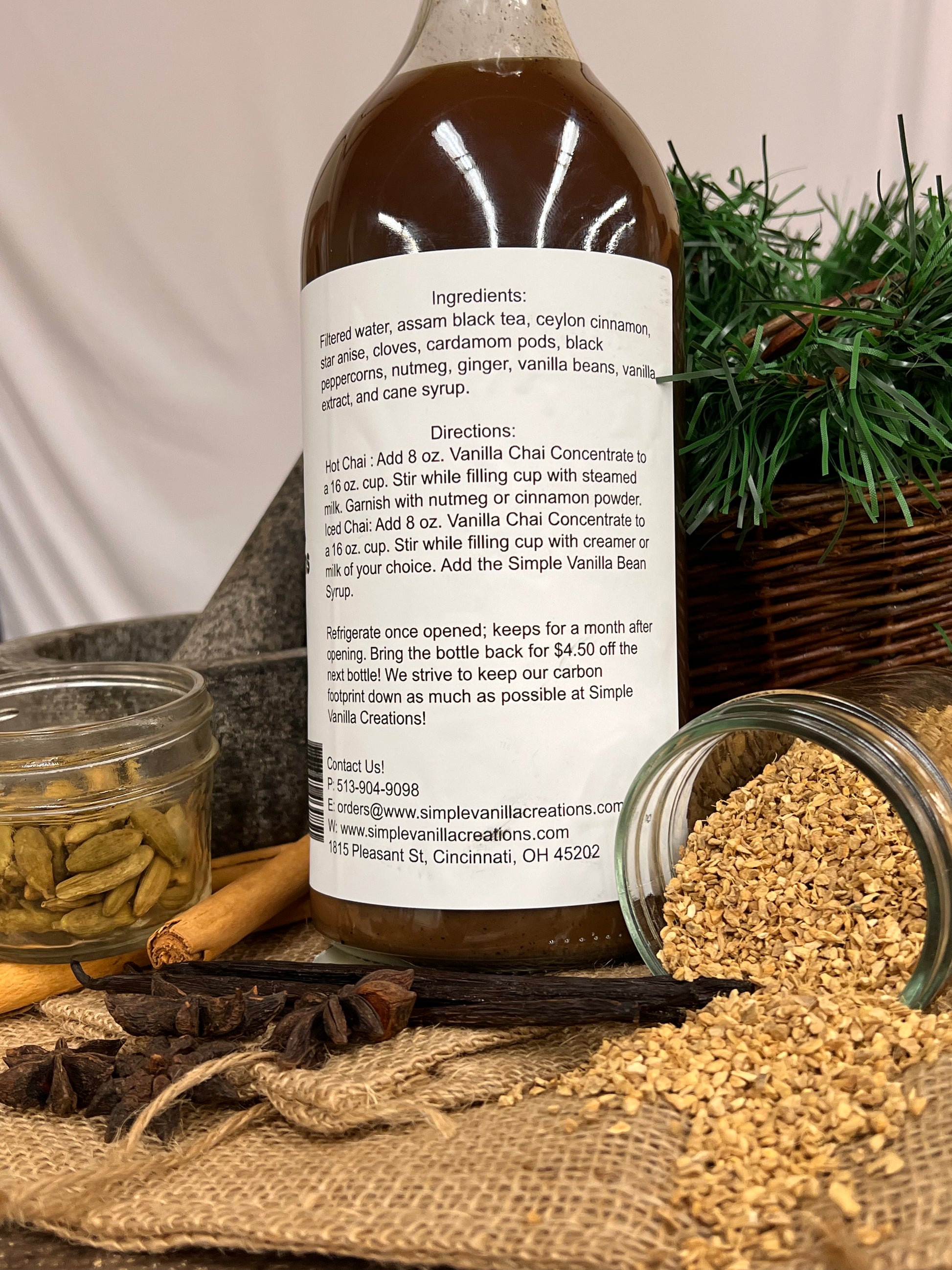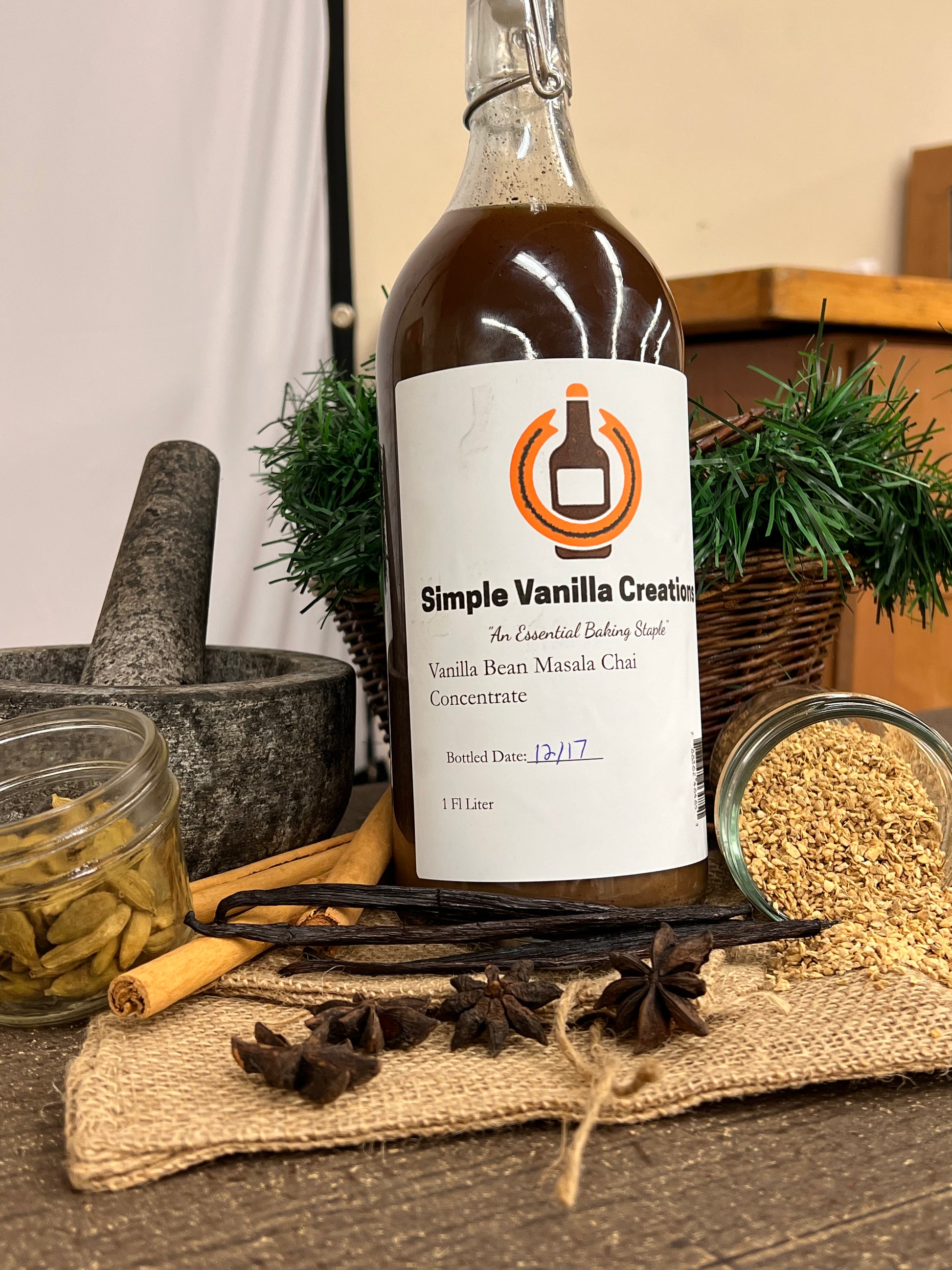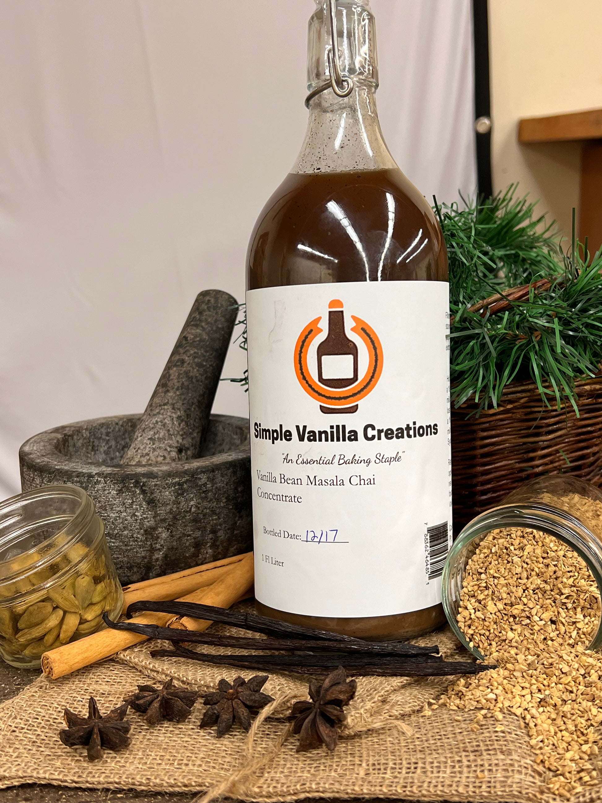 At Simple Vanilla Creations we specialize in making the highest quality of cooking and baking ingredients. We don't take shortcuts with our products including our Vanilla Bean Chai Tea Concentrate. We successfully have provided a genuine authentic chai experience for those who want to consume the highest quality chai tea. A lot of companies outsource their chai from other companies who mass produce their product and take the cheaper route during the production period. Our chai is going to have deeper notes to it, also features an authentic Indian Chai experience. Our Vanilla Bean Chai Tea Concentrate is made with black peppercorns, star anise, ginger, Ceylon cinnamon, vanilla beans, Madagascar vanilla extract, assam black tea, nutmeg, carom pods, cloves, cane syrup, and filtered water. You're going to get up to 8 servings of chai per bottle and you can make it to your liking.